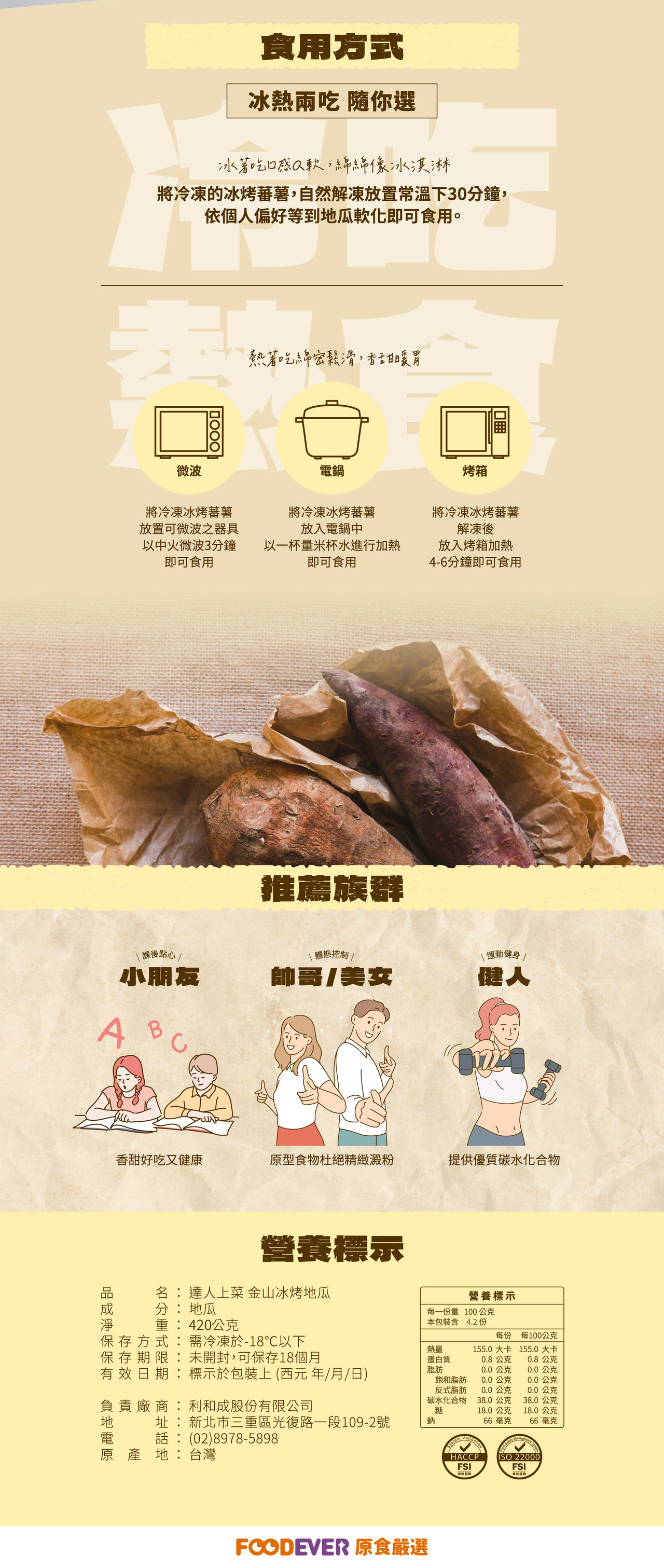 地瓜表皮含豐富的營養質,經過三道專業清洗處理程序,可以連皮一起吃進去,並且烹調方式多變化,冰溫熱皆可食用!