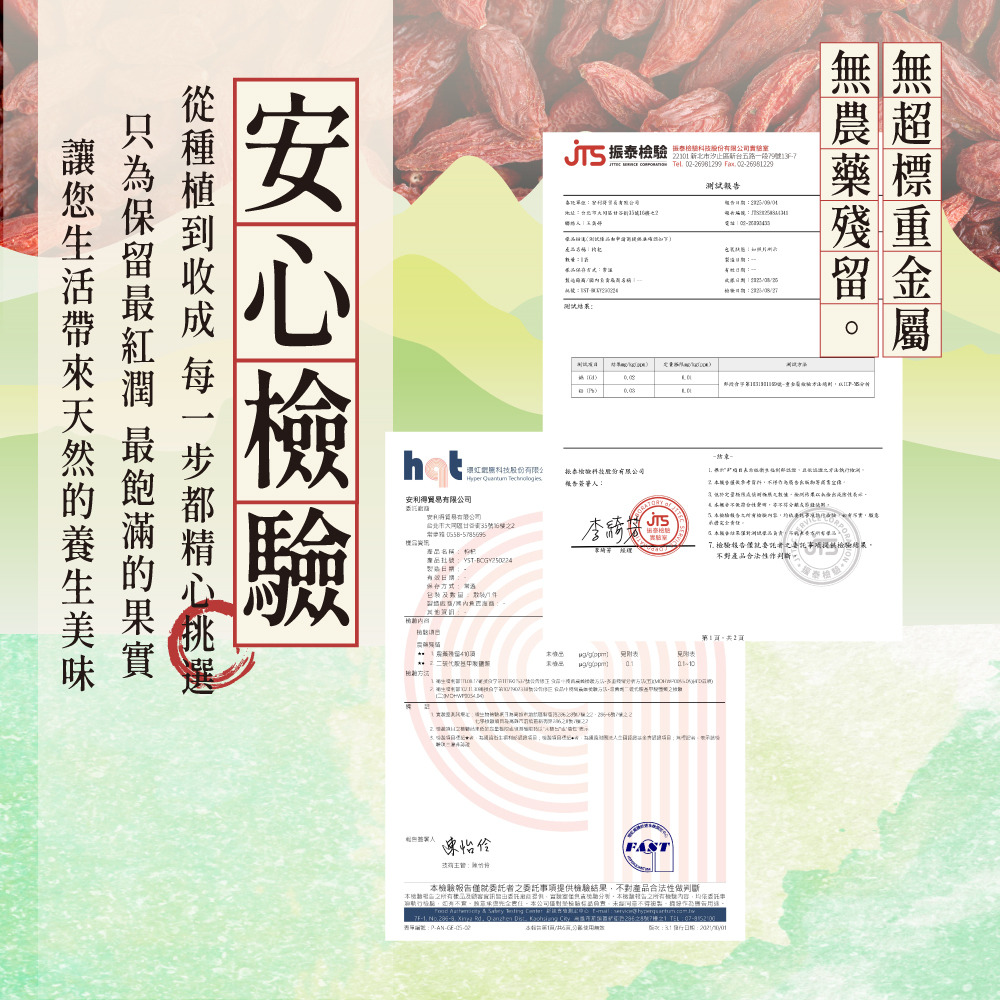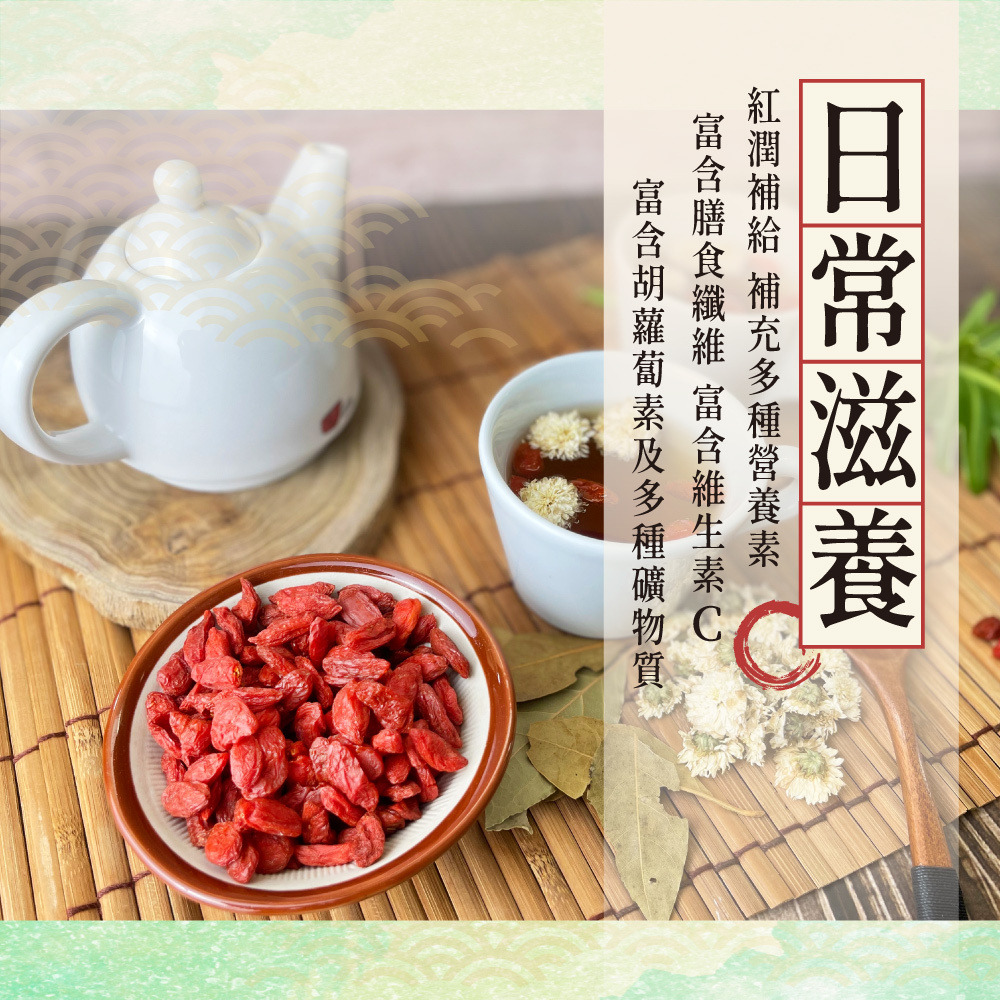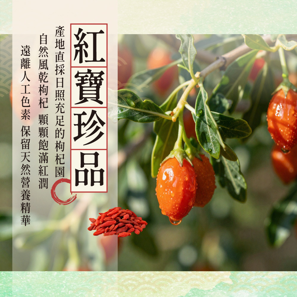 檢驗合格|即開即食|甘甜養生 紅潤飽滿,每一口都是天然滋養 通過檢驗報告認證,嚴選飽滿紅潤大顆枸杞,低溫乾燥鎖住營養,開封即食,也可沖泡、入菜,甘甜滋味暖心又養生 富含多種營養成分,檢驗合格、安全無添加,直接食用方便補給,日常養生必備 無防腐劑、無人工色素,枸杞乾自然原味,適合泡茶、煲湯或當零食