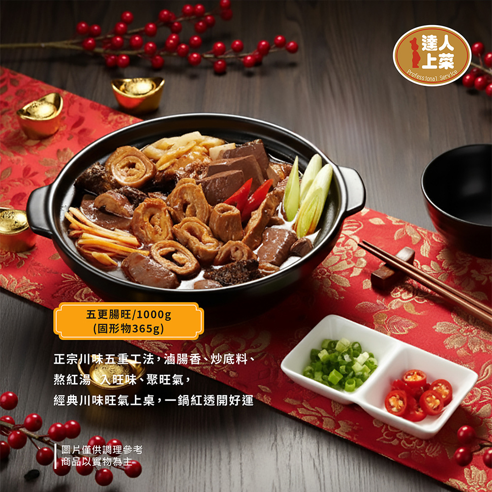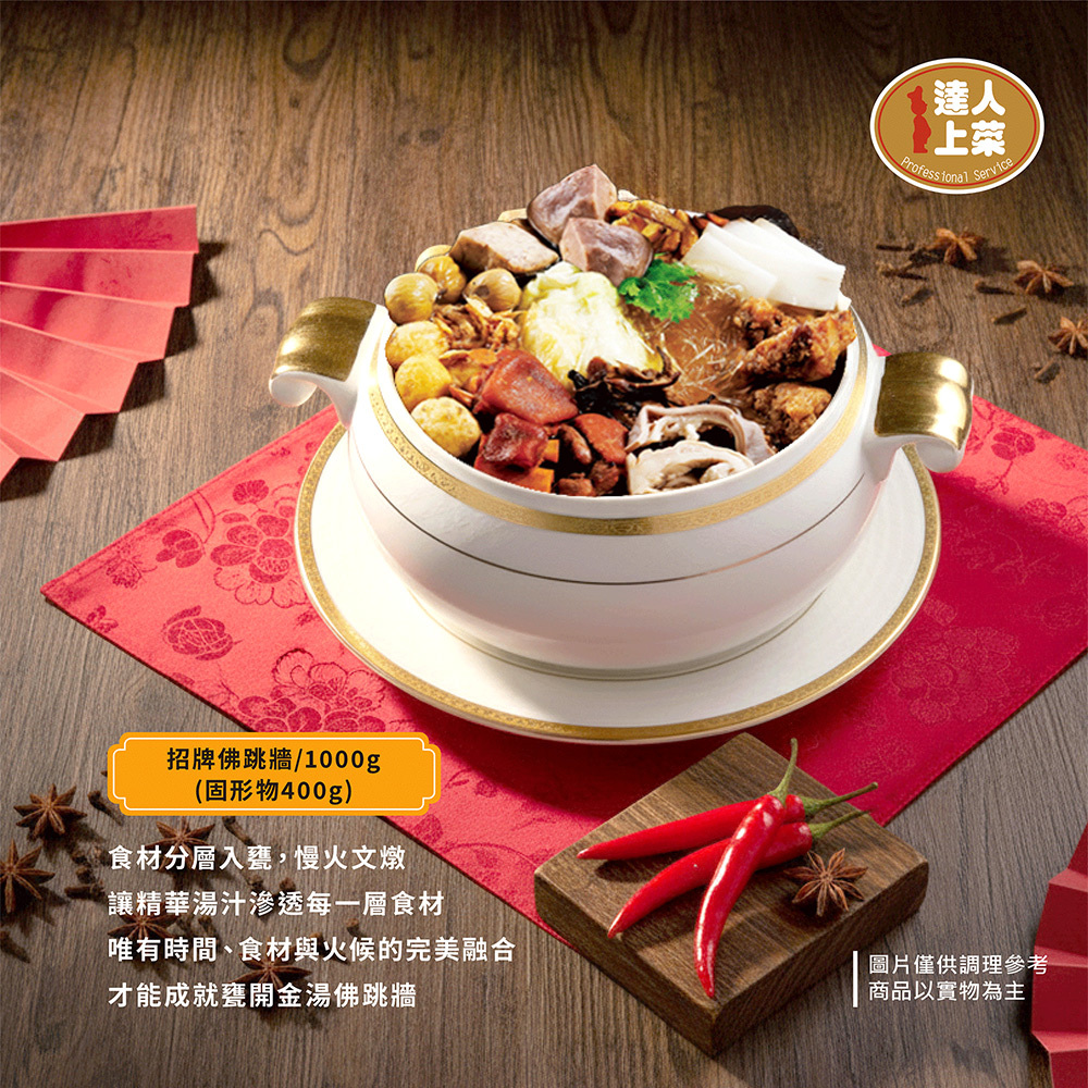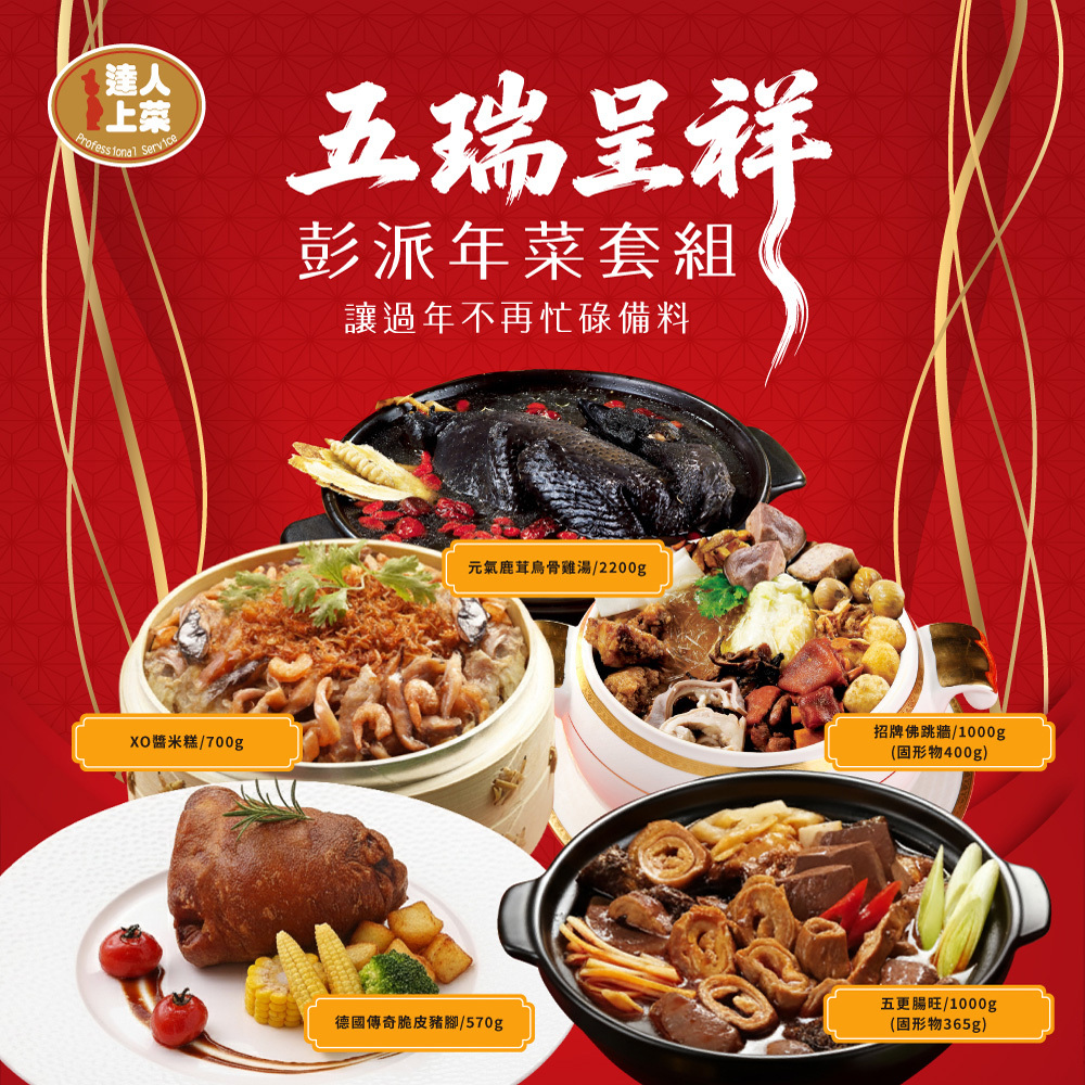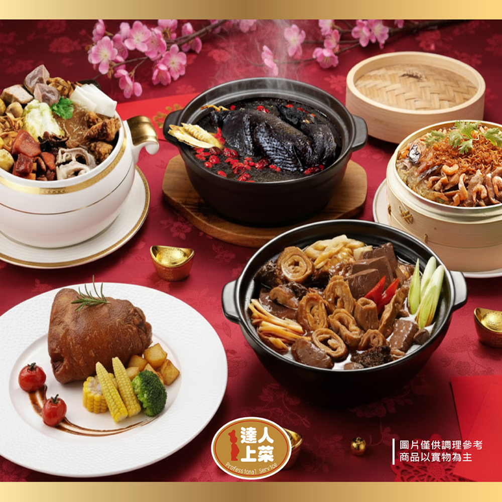 【達人上菜】嚴選道道經典:養生濃郁的「佛跳牆」、金黃酥脆的「脆皮豬腳」、滋補溫潤的「烏骨雞湯」、香氣四溢的「XO醬米糕」,再加上開胃又下飯的「五更腸旺」,五瑞呈祥、好運滿滿。